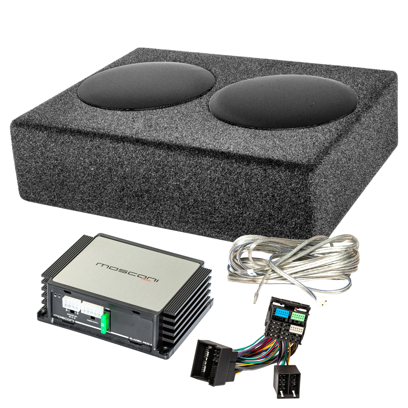 Dieses Set kombiniert eine leistungsstarke 6-Kanal DSP Endstufe, einen hochwertigen 25-cm-Subwoofer im geschlossenen Gehäuse und einen fahrzeugspezifischen Plug & Play Quadlock-Kabelsatz zu einem perfekt abgestimmten Gesamtpaket.